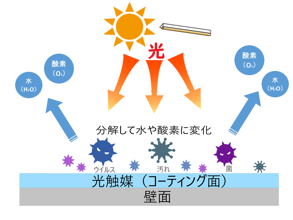 光触媒反応により、防汚・大気浄化・防臭・抗菌・抗ウイルスなどの効果が期待できます。