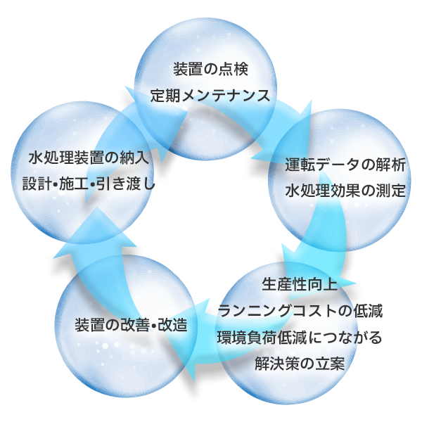また、生産増強・生産品目変更などによる水質・水量の変化や、環境負荷低減、省エネルギーの推進など、水処理薬品も含めた各部門の総合力を活かし、お客様のニーズを的確に捉えて、さまざまな改善策を提案しています。